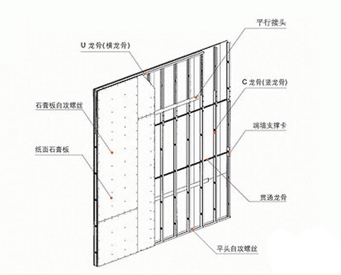 12、电气铺管、安装附墙设备:按图纸要求预埋管道和附墙设备。要求与龙骨的安装同步进行,或在另一面石膏板封板前进行,并采取局部加强措施,固定牢固。电气设备专业在墙中铺设管线时,应避免切断横、竖向龙骨,同时避免在沿墙下端设置管线。