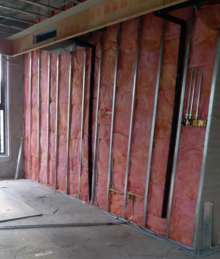 (9)铺放墙体内的玻璃棉。矿棉板、岩棉板等填充材料,与安装另一侧纸面石膏板同时进行,填充材料应铺满铺平。