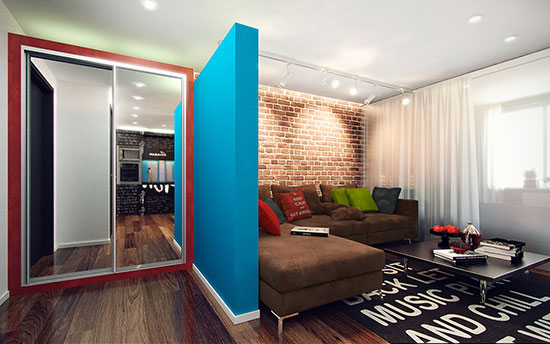 穿过蓝色的隔断墙,咱们来到双面大镜子前,看到镜子里呈现的是室内空间的镜像,但咱们看不到的是藏在它背面的隐秘。其实,这是一个衣柜。四周赤色边框,跟蓝色的隔断墙在颜色上有个对比和杰出。镜子是移门,它的存在把空间直接放大一倍。说这是小户型?但看上去一点也不小。