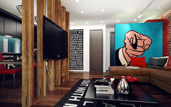 打开房门,一眼望去处处惊艳,亮点真实太多。先是充溢浓浓复古风情的红砖墙,让你的眼睛不自觉地就被它招引。沙发周围一面造型特别的隔断墙,大块的天蓝色布景想低沉都难,比这更抓人的是那个指着你的手指,如同在对你说“I WANT YOU”。尽管茶几跟沙发选用的都是深色精约款,但是因为有是非地毯的烘托,一点也不会觉得烦闷。